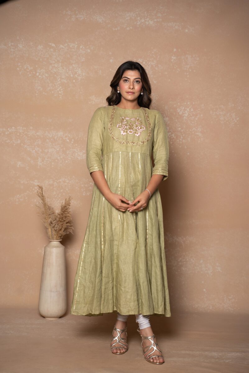 Green linen thread and nakshi embroidered anarkali with gota patti in the kalis paired with georgette dupatta.