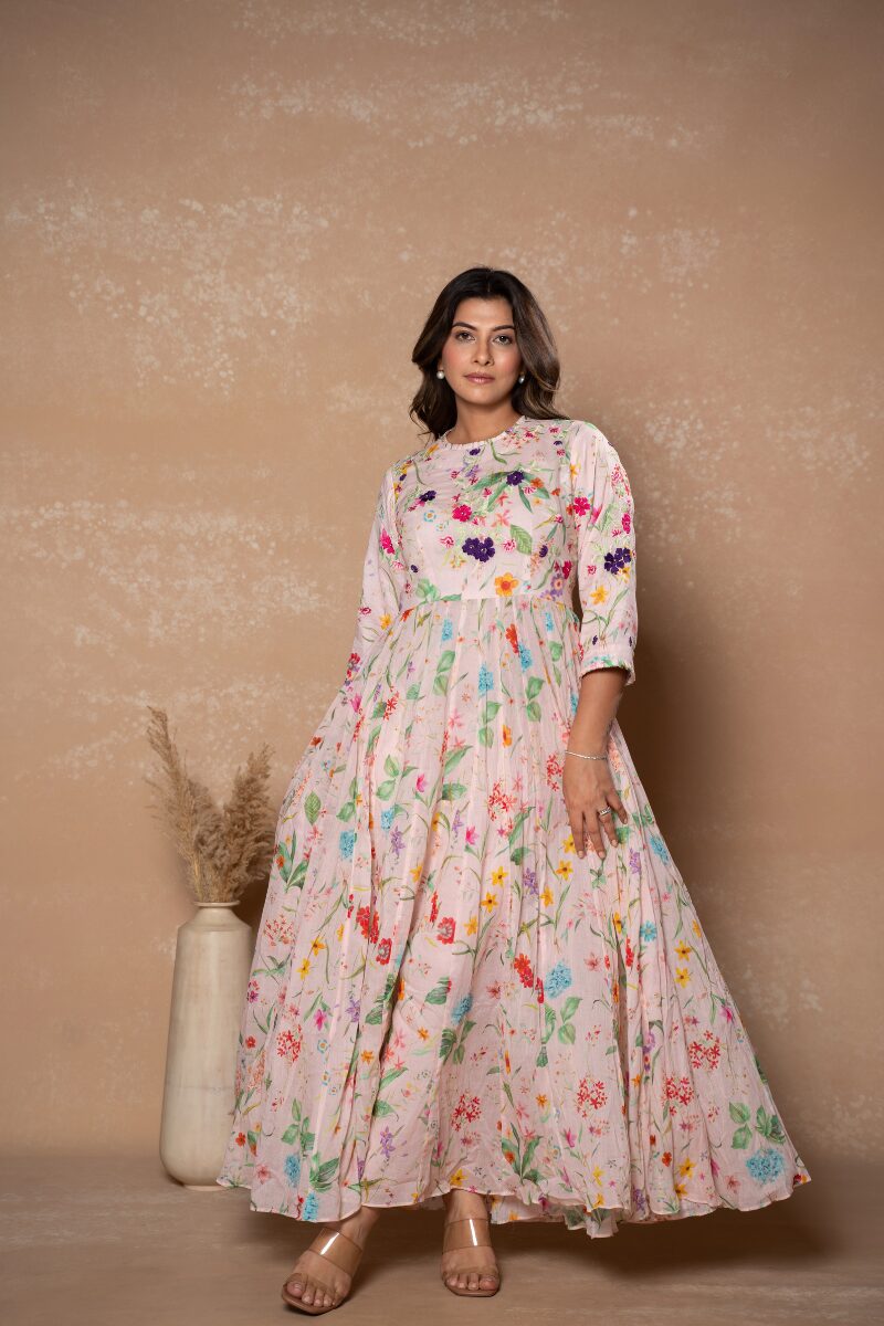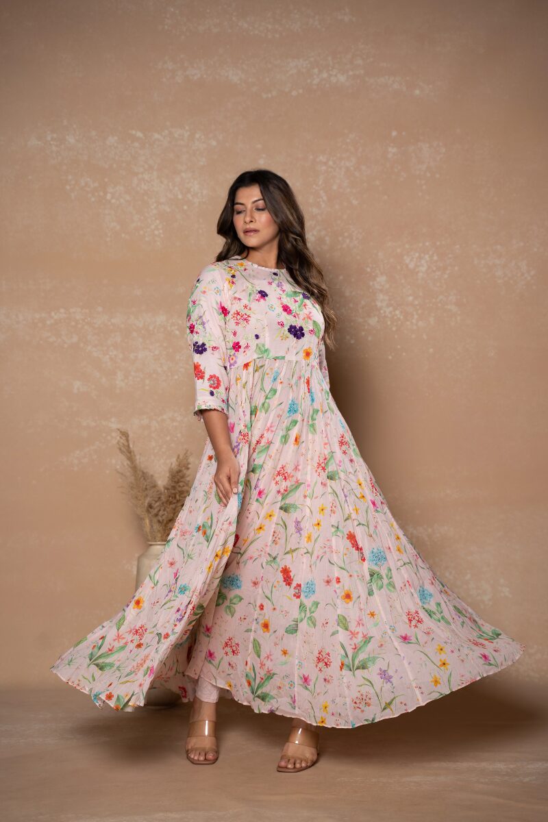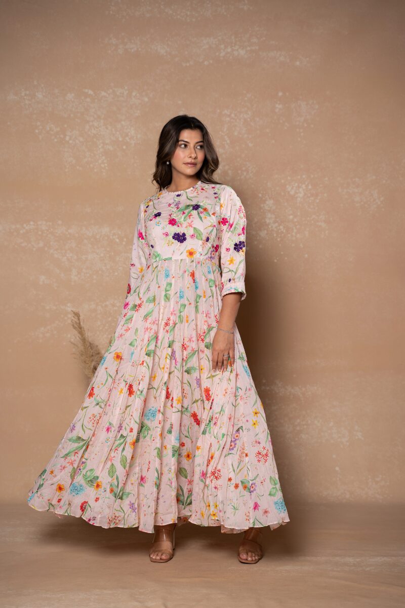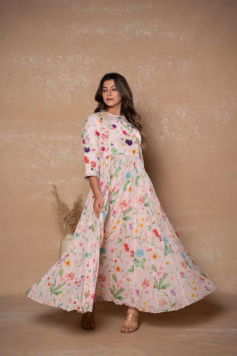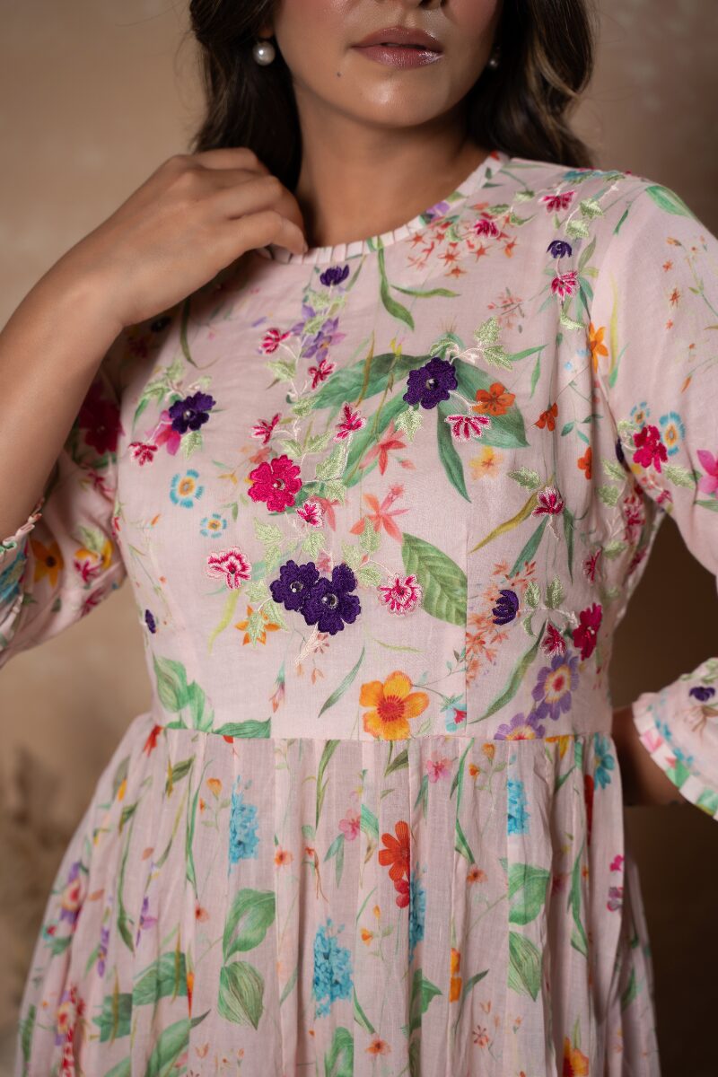 Pink mulmul digital print floral anarkali with thread embroidered yoke and sleeve.