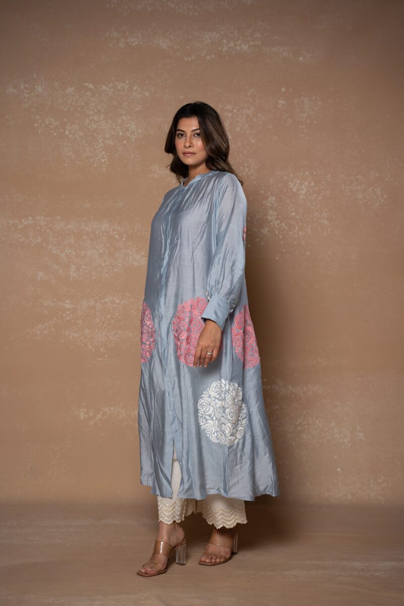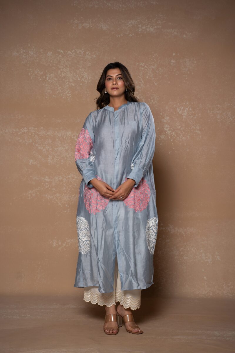 Powder blue chanderi silk kurta with resham embroidered butta all over the kurta.