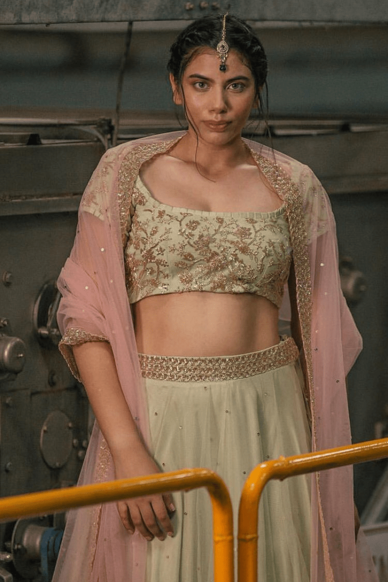 Featuring a green net lehenga paired with heavily embroidered blouse and net dupatta with embroidered border on all 4 sides.
