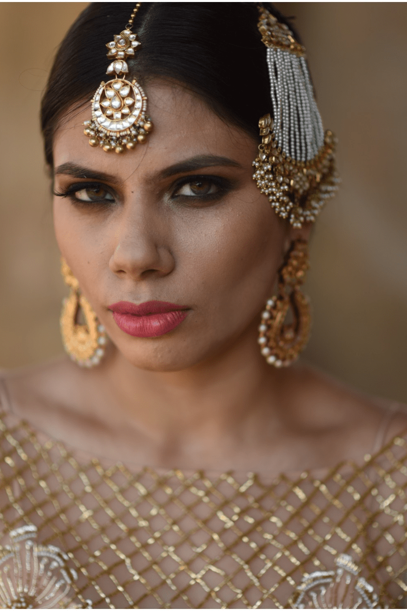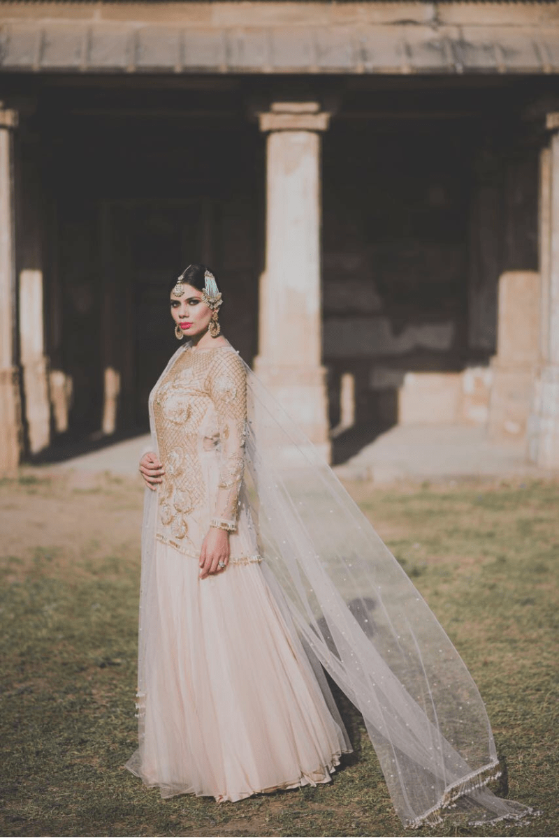 Featuring a beige sharara with glass pipe and pearls paired with a skirt and a dupatta.