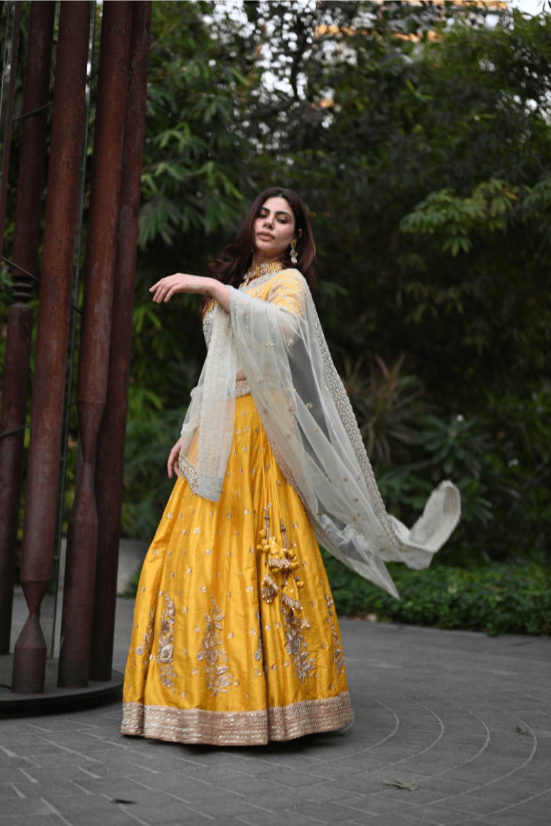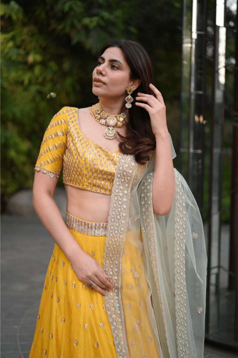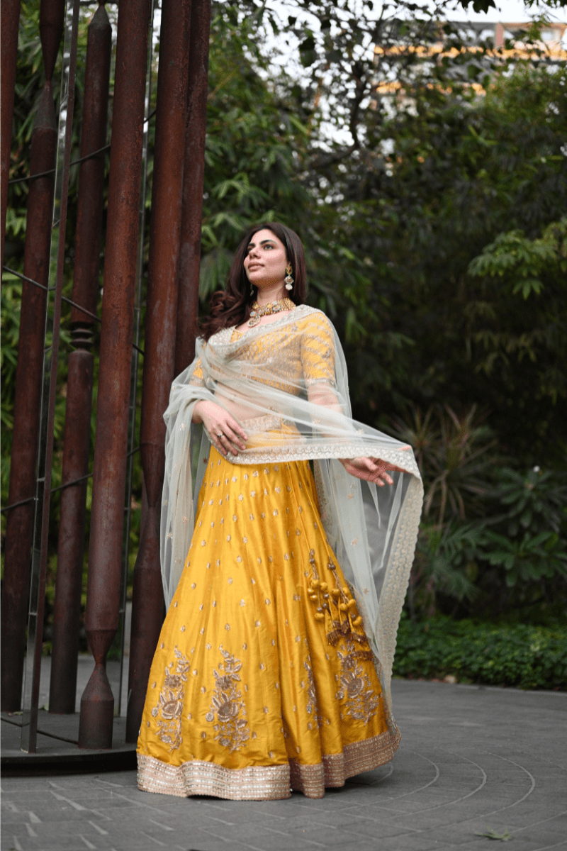 Featuring a marigold yellow lehenga with zardosi butta embroidered in the lehenga and blouse paired with a teal green net dupatta with zardosi embroidery