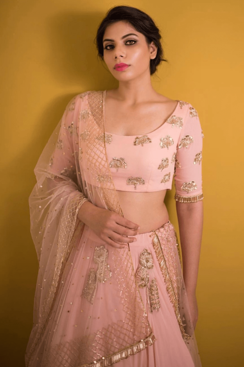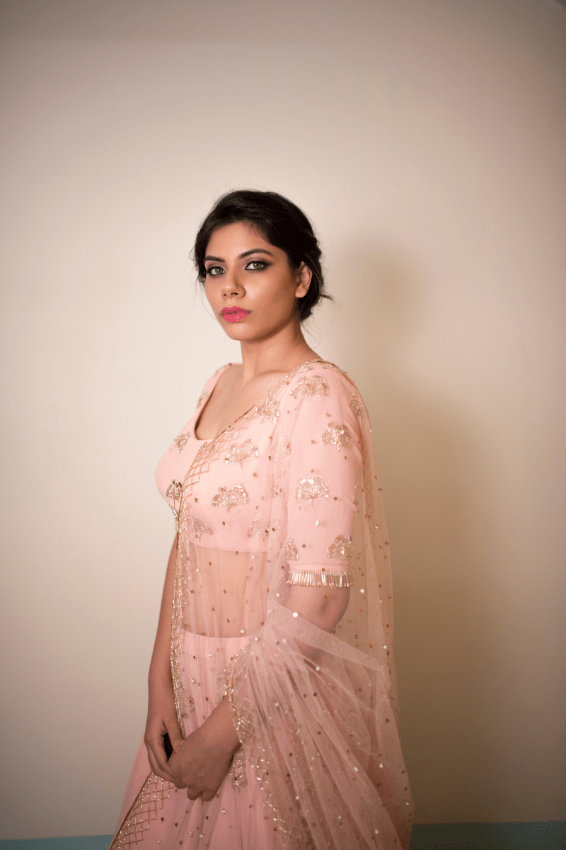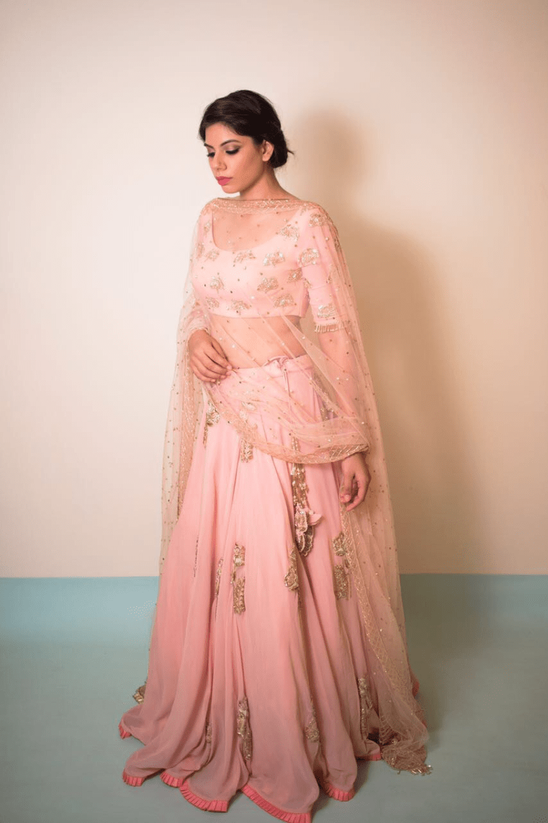 Featuring a peach lehenga in georgette with kamdani buttas and pearls embroidered in the lehenga and the blouse along with a net dupatta.