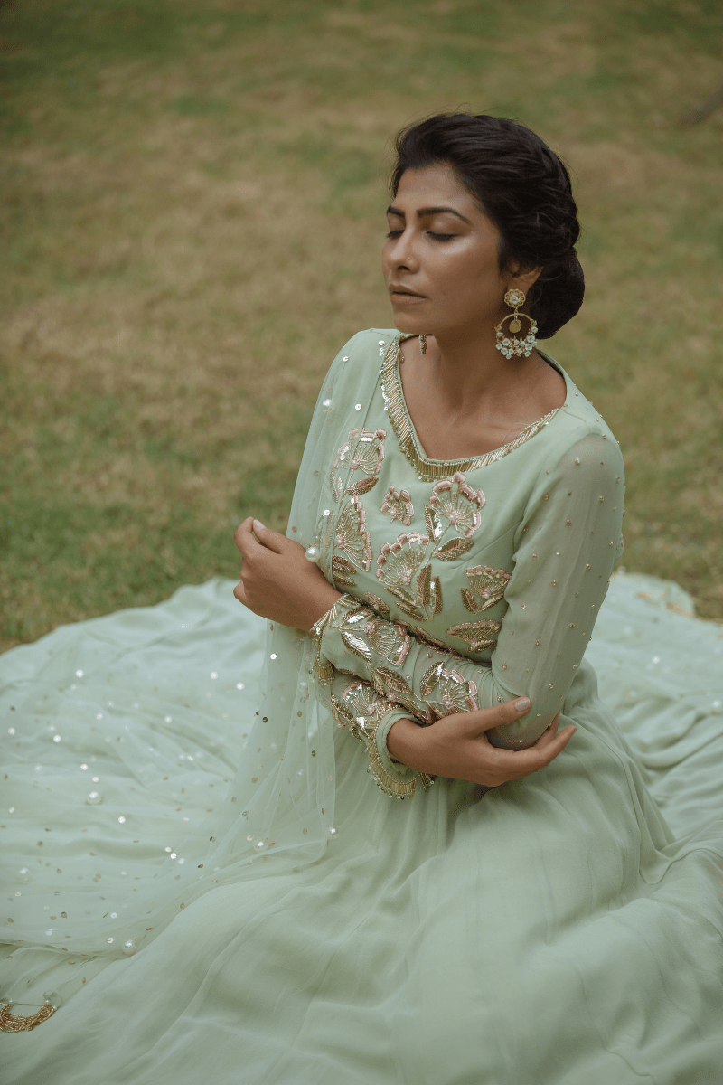 Featuring a mint green anarkali with kamdani and thread embroidered all over the yoke and paired with a dupatta.