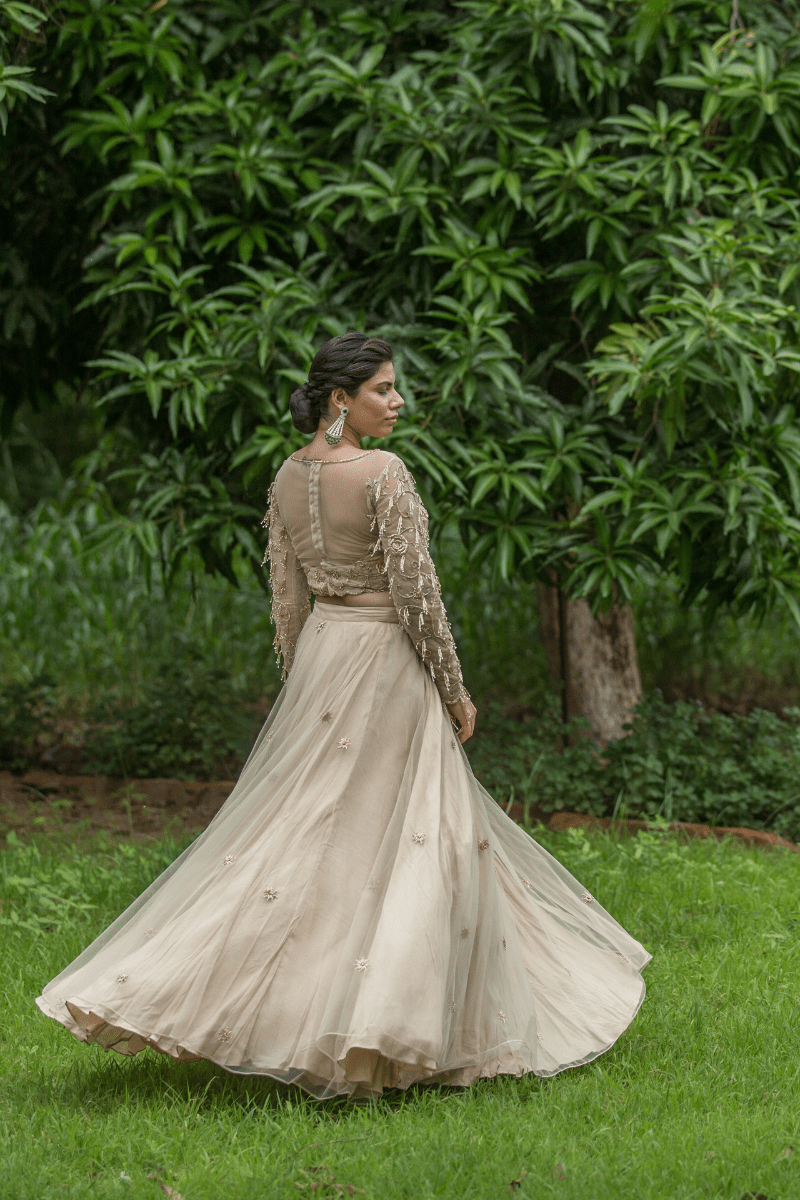 Featuring a beige lehenga set with zardosi embroidered blouse and scattered buttas all over the lehenga paired with a dupatta.