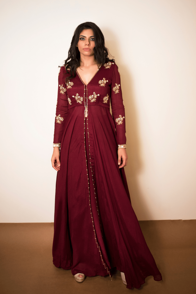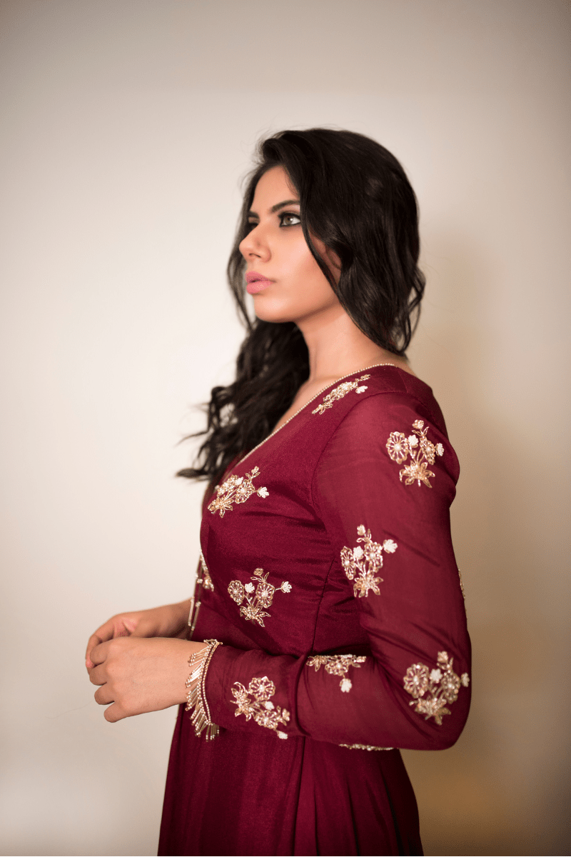 Featuring a maroon anarkali with gold sequins embroidered buttas all over the yoke. Comes along with a pant.