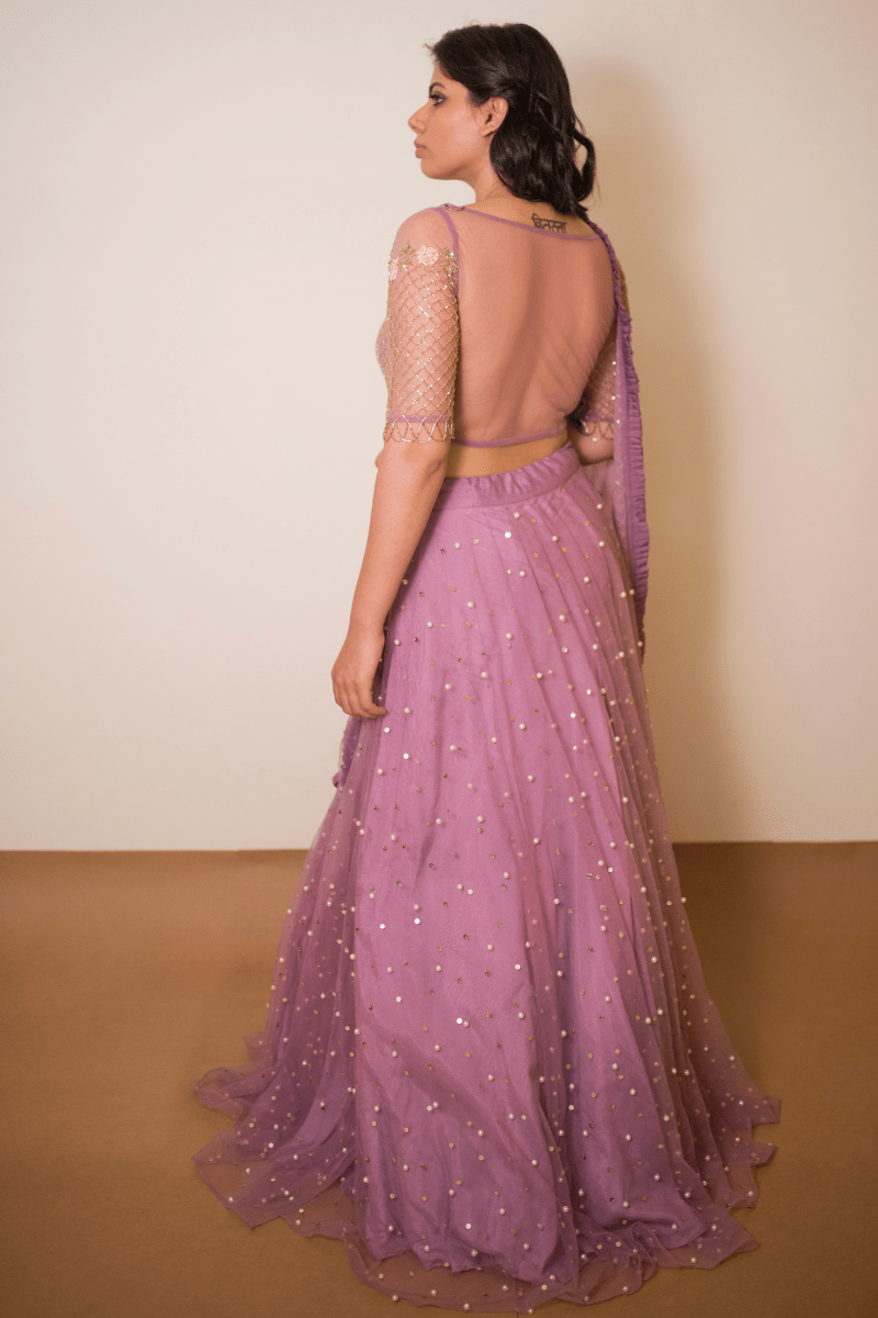Featuring a purple net lehenga with embroidered net blouse and a georgette dupatta. Embroidered in gold glass pipe and sequins.